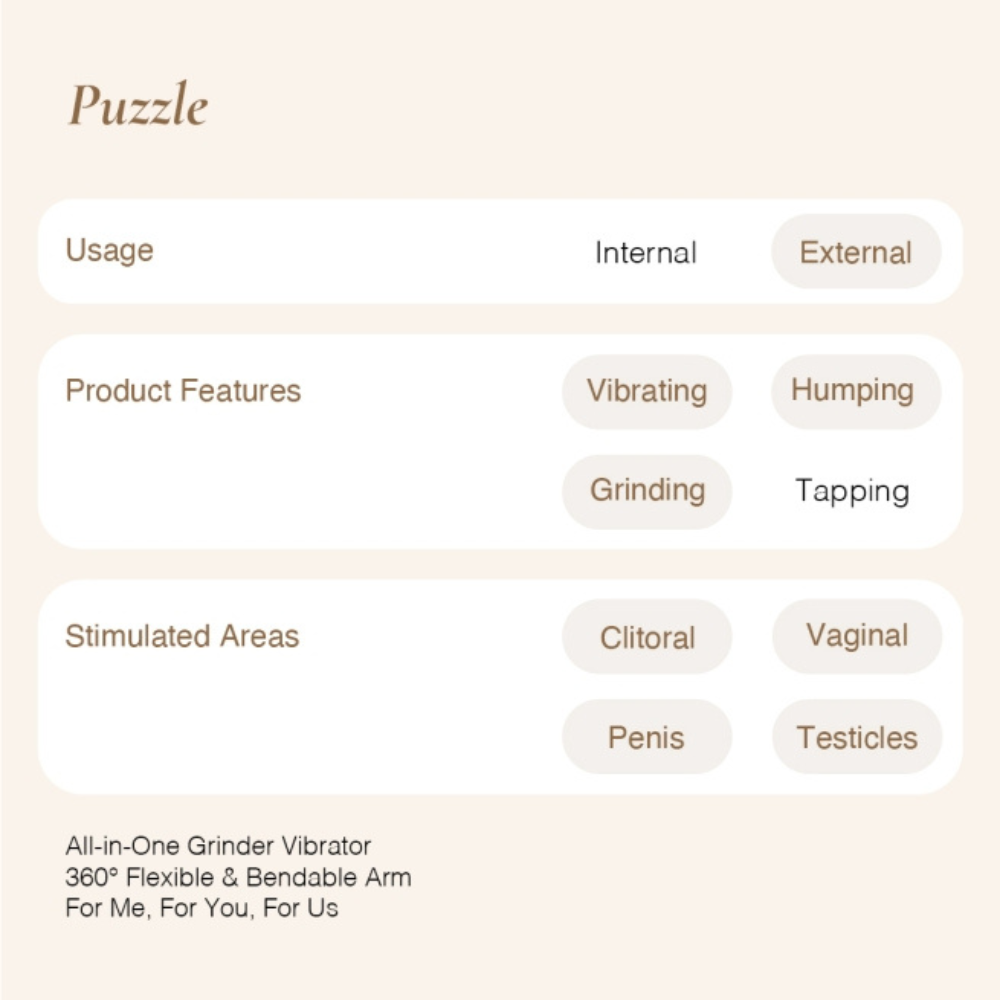 Puzzle is more than just a toy, it's a fully flexible grinding pad designed to elevate external pleasure, solo or shared. With 360° bendability, triple motors, and more than 48 combinations of speed and patterns, Puzzle invites you to ride, rub, or wrap it any way you like. Use it on a bed, chair, or with a partner. Every configuration delivers deep, customizable stimulation exactly where you want it. Whether you prefer slow grind sessions or hands-free clitoral ecstasy, Puzzle adapts to your desires and positions with effortless ease.