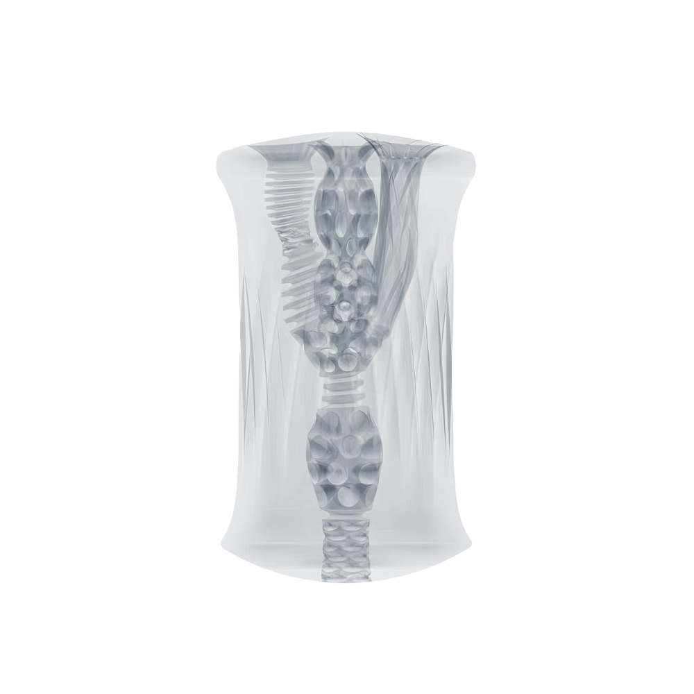One, a super stimulating ribbed channel. Another, a dual-chambered tunnel filled with teasing ridged nubs. And the third, a swirling vortex full of stimulating waves. All three channels finally converge into one, finishing off with a thrilling combination of textures.